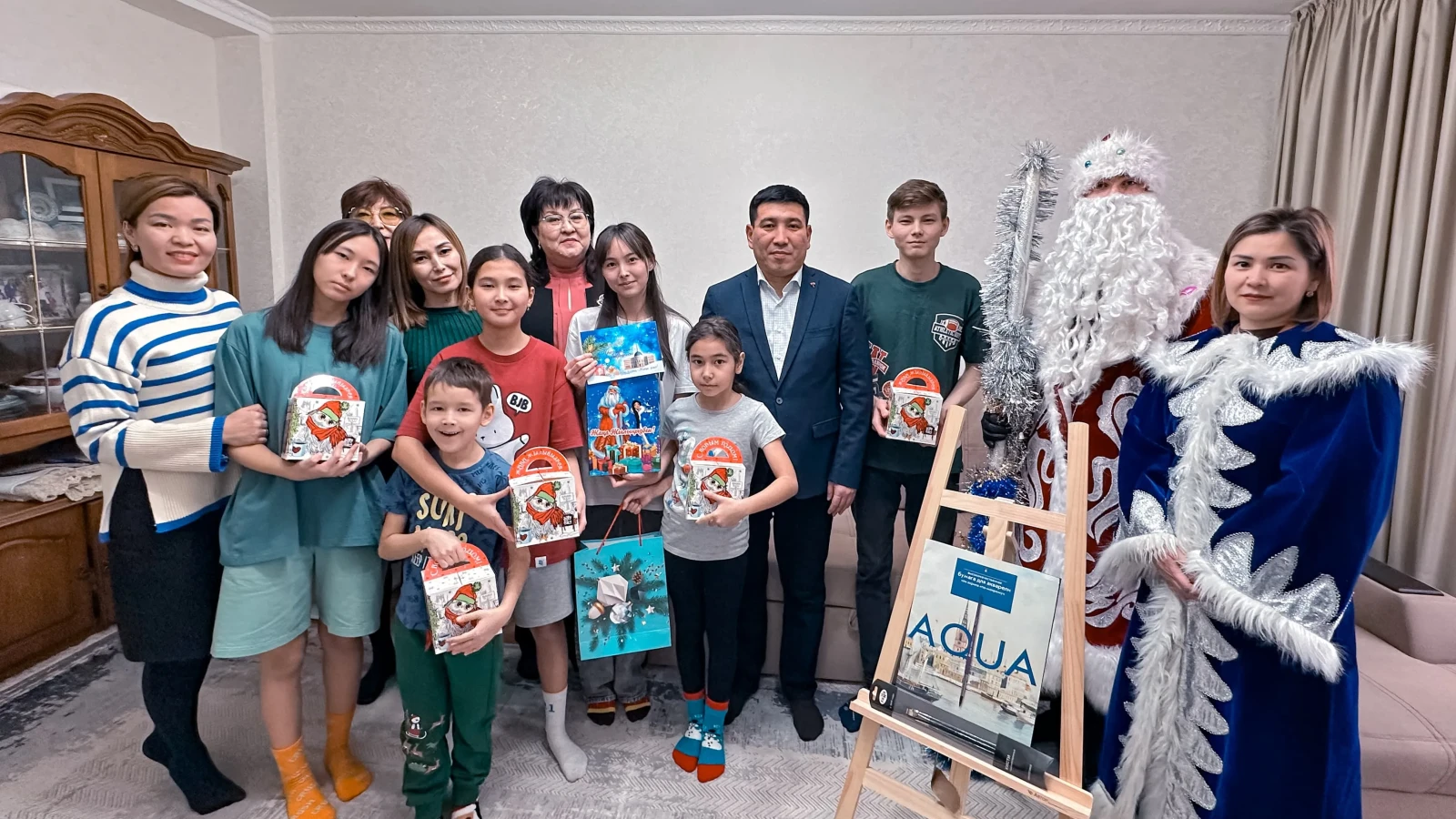 29 декабря аким города Миржан Сатканов вместе с новогодними героями - Дедом Морозом и Снегурочкой - посетил дом Дины. Он поздравил девочку и ее братьев, которым подарил сладости. А Дине по ее просьбе подарил мольберт и инструменты для рисования.