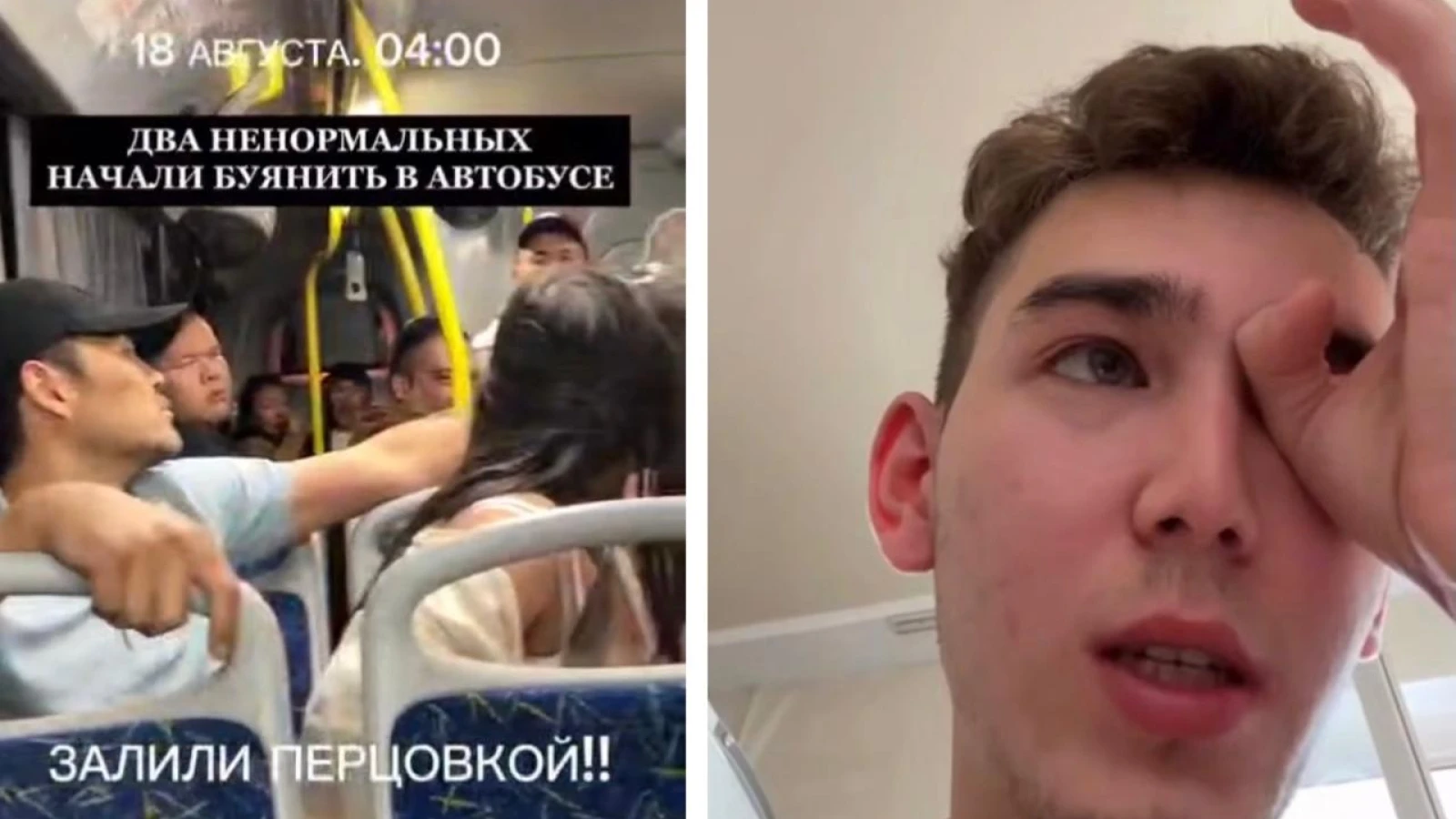 На кадрах девушка и молодой человек, который ее обнимает, сидят на двойном сидении в автобусе и на повышенных тонах разговаривают с другими пассажирами. После чего мужчина разворачивается и брызгает из баллончика в лицо девушке, которая сидит позади него. Затем он брызгает из баллончика в лицо и снимающему видео, а потом атакует еще нескольких пассажиров автобуса. Первая из пострадавших пассажирок приходит на помощь окружающим и наносит агрессору несколько ударов.
