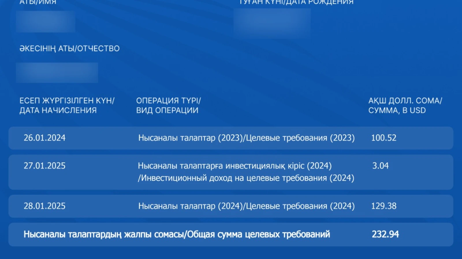 Первые деньги поступили на счета маленьких казахстанцев 31 января 2024 года. Она составляла 100,52 доллара США. В этом году начисление сделали 31 января. На счета казахстанских детей поступило 129,38 доллара США. На конец 2024 года общее количество участников программы составило 6 921 035 детей.