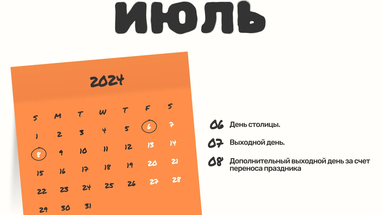 8 июля, понедельник: дополнительный выходной день за счет переноса праздника.