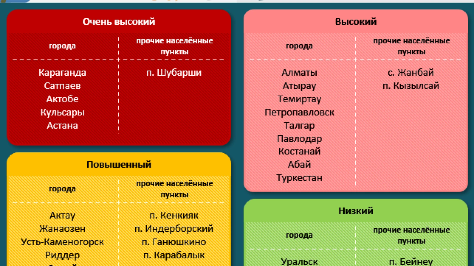 Ещё 11 городов и посёлков попали в группу с высоким уровнем загрязнения. Среди них — Алматы, Атырау, Темиртау и Павлодар.