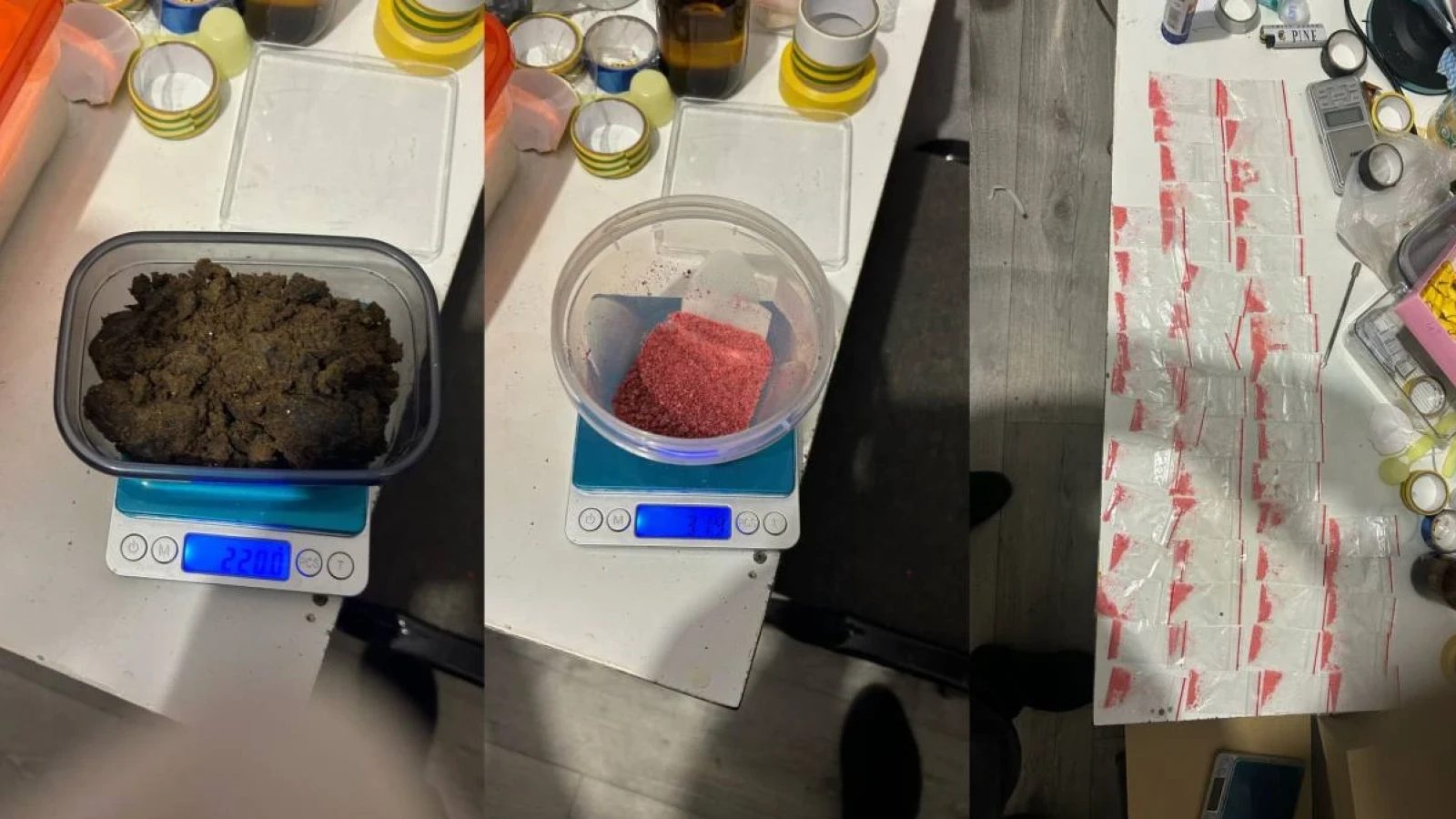 При обыске арендуемой квартиры были обнаружены ещё 125 свёртков с аналогичным содержимым, пять контейнеров с порошком белого и красного цвета, один контейнер с веществом каменисто-тёмно-серого цвета, а также электронные весы, ZIP-пакеты и изолента.