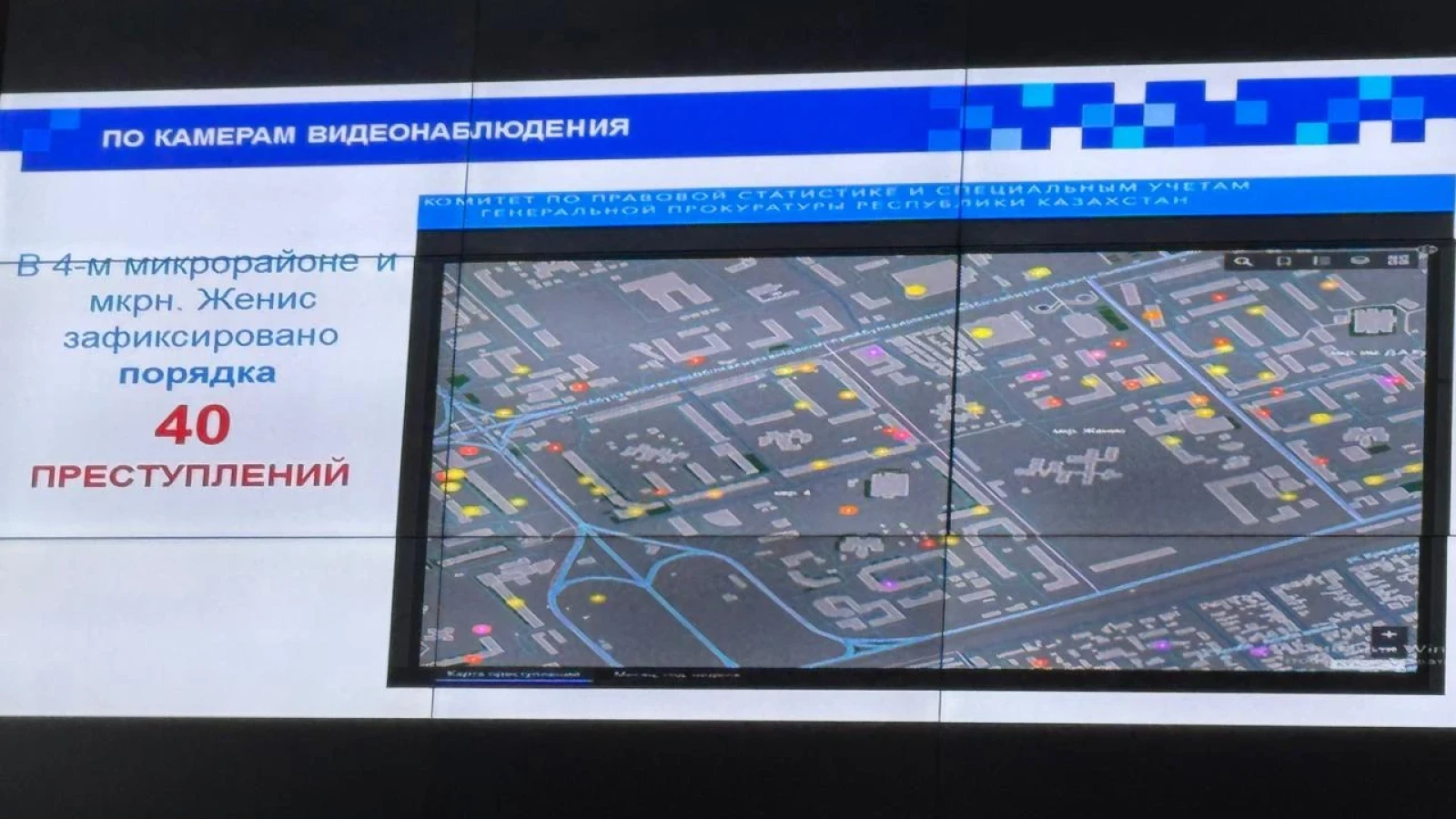 — В жилом квартале между улицами Сарайшык и Сейфуллина совершено более 40 преступлений, в районе центрального рынка более 60 уголовных правонарушений, более 50-ти преступлений совершено в районе City Center ( в квадрате между улицами Петровского, пр-т Абая, Ярославской и Молдагуловой). Микрорайоны также сильно не отстают, только в 4-ом микрорайоне и в микрорайоне «Женис» зафиксировано порядка 40 преступлений, в большинстве случаев это кражи, хулиганство и грабежи, — пояснил Азамат Кустанов.