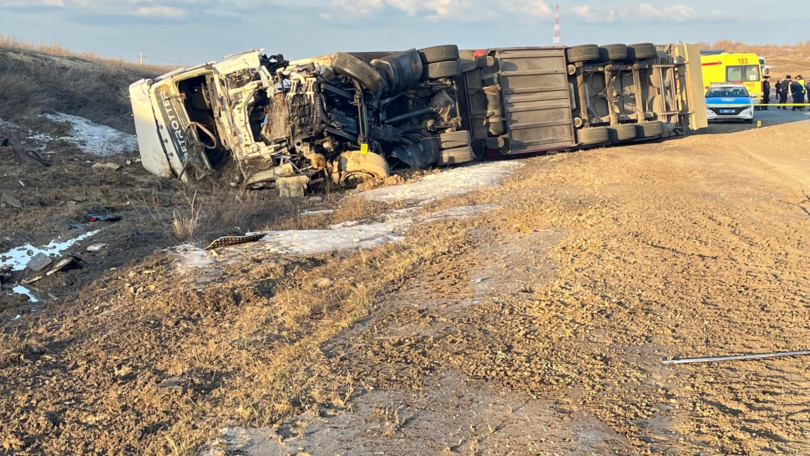 Как сообщили в департаменте полиции Актюбинской области, по предварительным данным, у грузового автомобиля лопнуло колесо при движении, водитель потерял контроль за транспортом и выехал на полосу встречного движения, где и произошло столкновение.